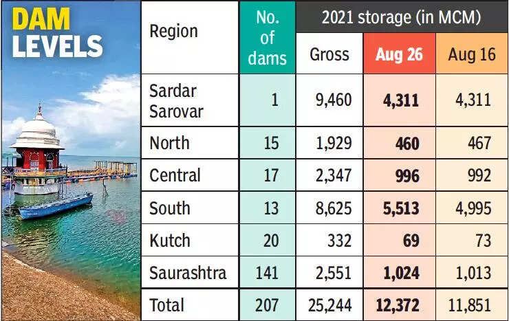AHMEDABAD: In the last 10 days, water storage levels in the dams of North Gujarat and Kutch registered a decline, while the dams in Saurashtra and Central Gujarat have registered a marginal increase in the storage. Overall storage in the 206 dams barring the Sardar Sarovar is 51.08% of their capacity of 15,784 MCM.