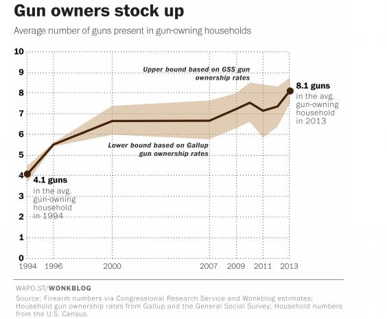 There are nearly twice as many guns in the average gun-owning household today as there were 20 years ago, according to new Wonkblog estimates based data from surveys and the Bureau of Alcohol, Tobacco, Firearms and Explosives. In 2013, there were an estimated 8.1 firearms in the typical gun-owning household, according to these data. In 1994, the average gun-owning household owned 4.2 guns.