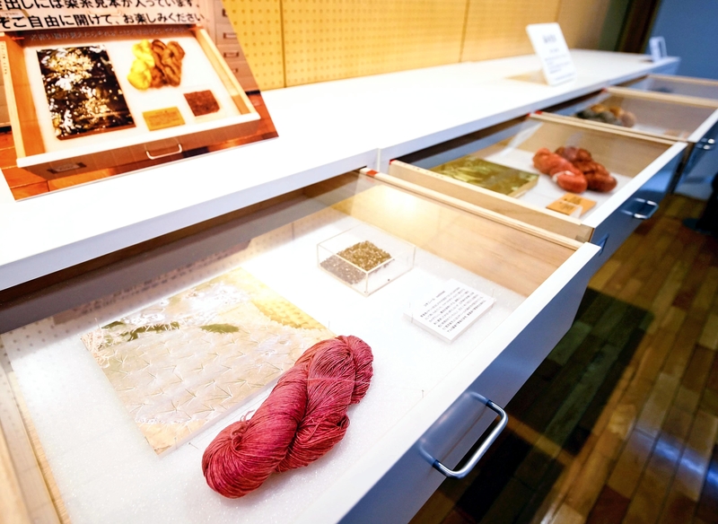 Threads dyed using various plants are also on display. Madder produces a bright pink or red, gardenia creates a golden color, and sappanwood produces a brown or red. The colors are all vivid without being harsh.