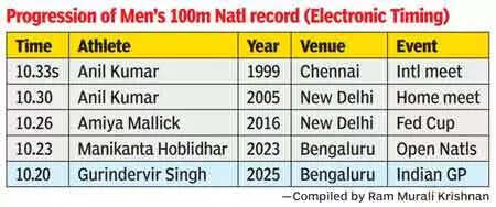 BENGALURU: Sprinter Gurindervir Singh is the latest example of heights Indian athletes can scale with the right support system. He snatched the national record in men's 100m from his training partner Manikanta H Hoblidhar, clocking 10.2 seconds to win the gold at the Indian Grand Prix 1 here on Friday.