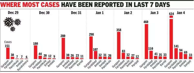 GURUGRAM: The city recorded 634 new cases of Covid on Tuesday, up sharply from 460 cases on Monday, and the highest single-day spike in infections after May 20 last year, when 1,091 people had tested positive.