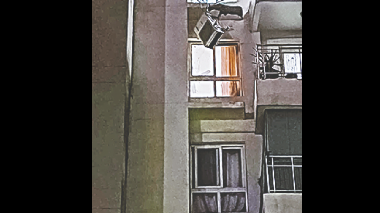 Images of the incident showed the ledge chipped from an edge and the external component of the AC hanging from the wires. “It is not clear if the service engineer lost his balance or if a part of the ledge came off,” a police officer said.