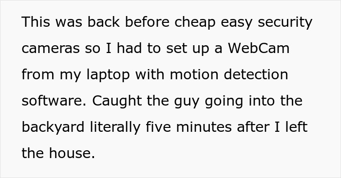 This was before Ring cameras ruled suburbia, so OP went full DIY detective. A laptop webcam, motion-detection software, and boom! Busted! The neighbor was casually strolling into his backyard and borrowing gas like it was a community pantry. Five minutes after OP left the house, no less. Bold. Too bold.