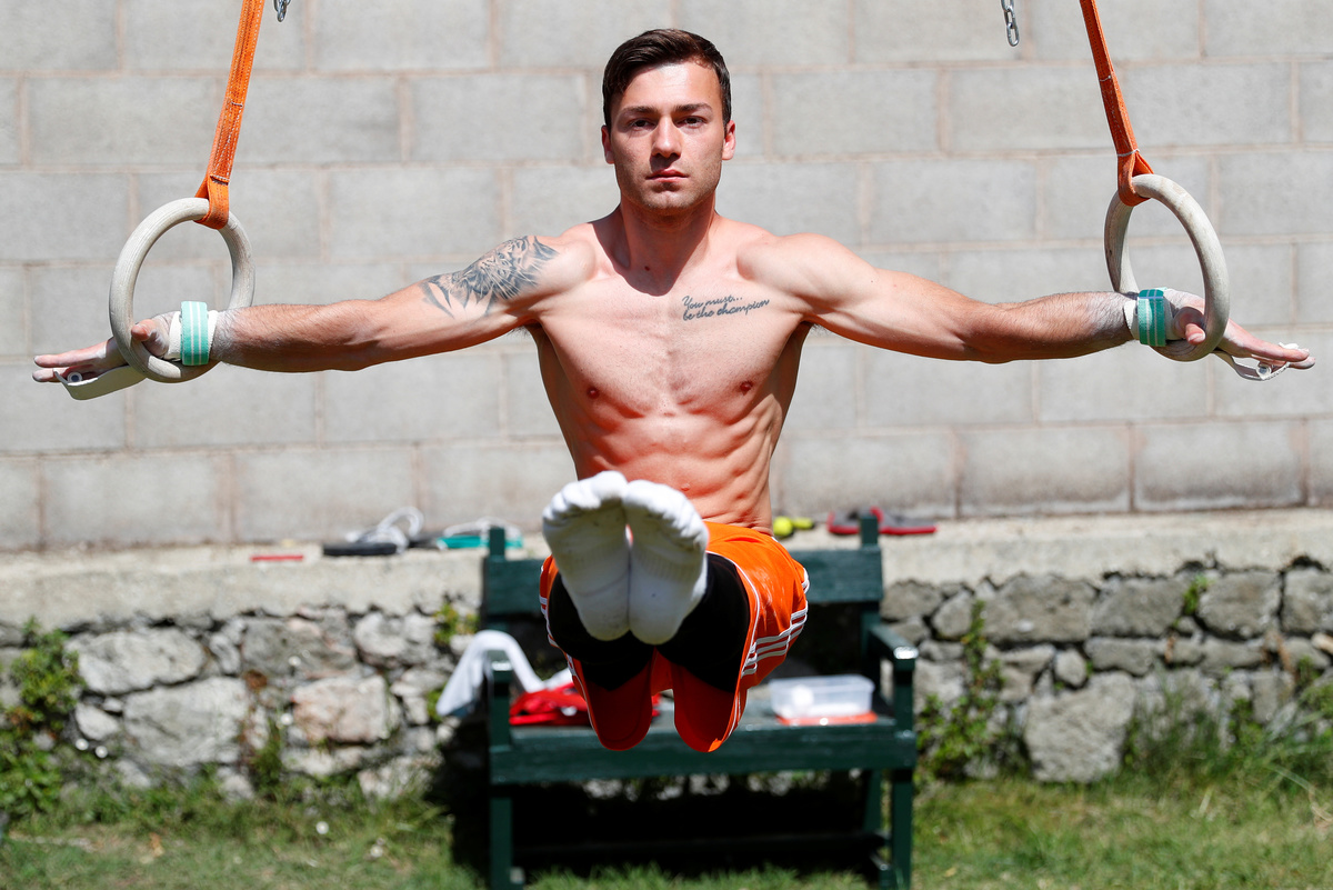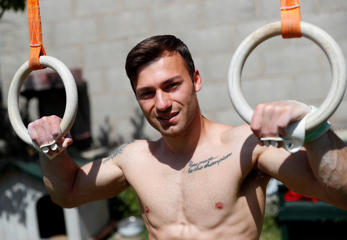 Gymnasts around the world have been trying to stay fit amid tough restrictions during the COVID-19 crisis, and Italy is no exception. With the country's gym clubs and training facilities closed for more than two months as part of government measures to contain the spread of the coronavirus, gymnast Marco Lodadio, a silver medallist in the rings event at the 2019 world championships, turned his garden into a fitness studio. Without the sophisticated facilities top-level athletes usually use, Lodadio worked on a swing structure to make it suitable for rings training.
