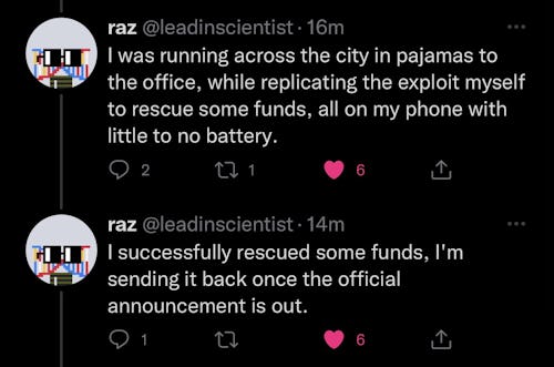 If there’s any bright side here at all, it’s that some white hat users claim to have participated in the hack with the intention of returning the money later on — scooping up funds before bad actors got to them first. It’s not quite ideal proof that crypto’s decentralization has its perks, but it’s better than nothing.
