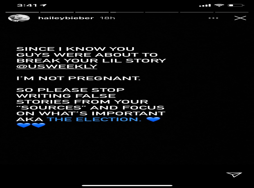 “Since I know you guys were about to break your lil story @USWeekly, I’m not pregnant,” Bieber wrote on her Instagram Stories. “So please stop writing false stories from your ‘sources’ and focus on what’s important aka the election.”