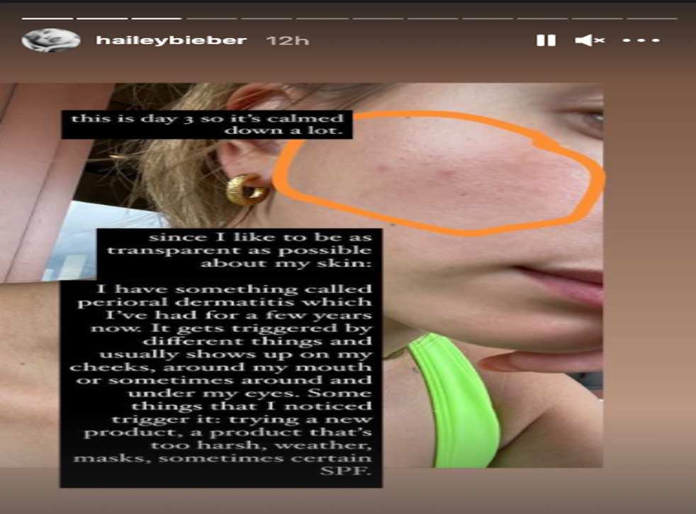 Hailey Bieber has revealed she suffers from a skin problem called perioral dermatitis, which causes a red rash and bumps on her face.