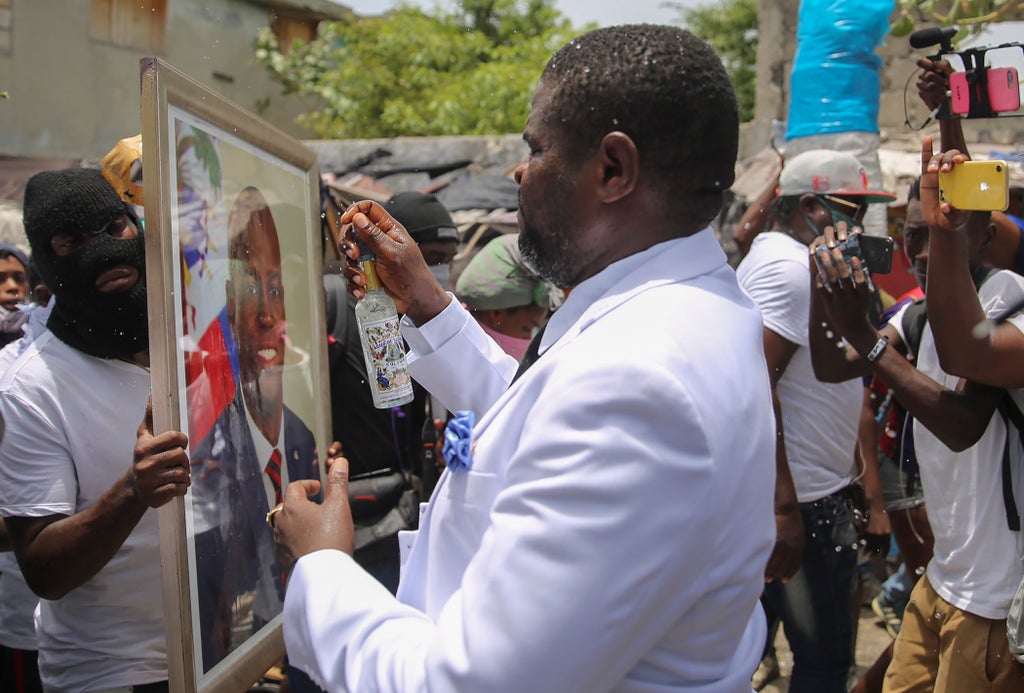 He was wearing a white suit and black tie as he spoke to the crowd at the seaside slum of La Saline in the capital of Port-au-Prince A nearby truck played music as Cherizier knelt down before a large portrait of Moïse and began to light candles.