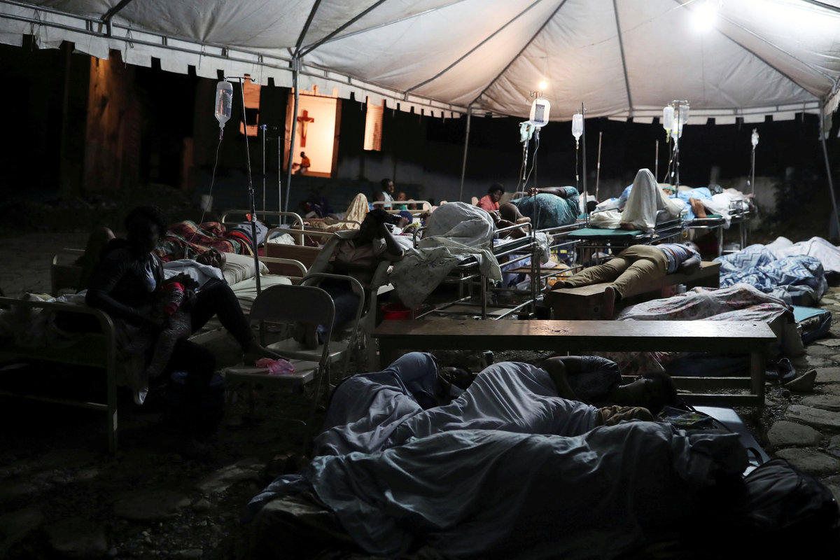 People injured in an earthquake that hit northern Haiti late on Saturday, are being looked after in a tent, in Port-de-Paix, Haiti. REUTERS/Ricardo Rojas