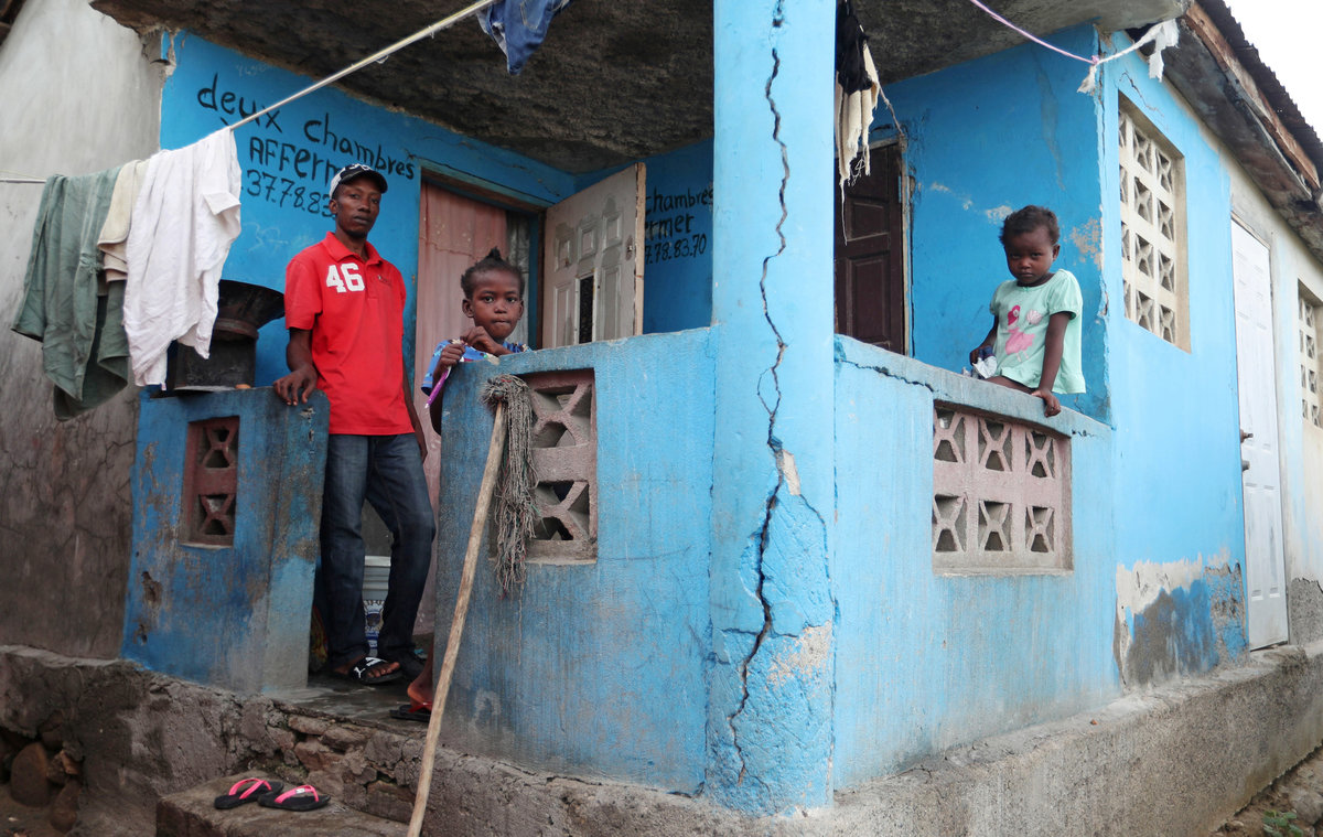 A man and two children stand on the porch of their home after it was damaged in an earthquake, that hit northern Haiti late on Saturday, in Port-de-Paix, Haiti. REUTERS/Ricardo Rojas