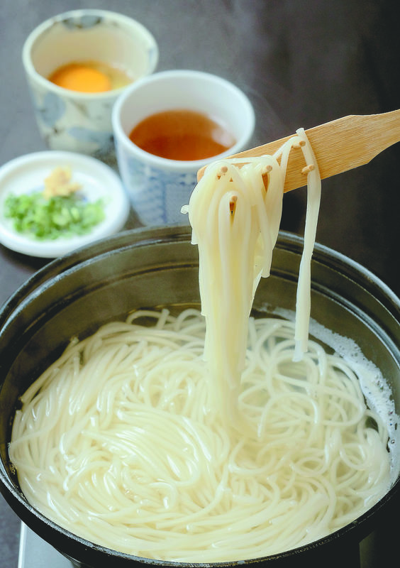 The dish was served to me in an iron pot with boiling water, from which I scooped up the noodles to dip in a cup containing a beaten egg and another containing broth made from flying fish.