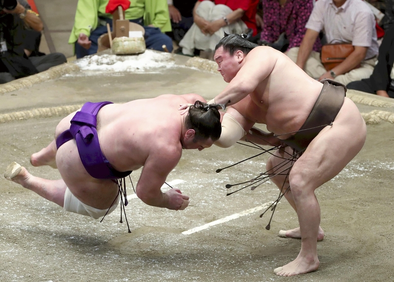 Meanwhile, ozeki Goeido remains in a group of three at two losses behind Hakuho, picking up his 10th win by slapping down No. 4 maegashira Abi (6-6).