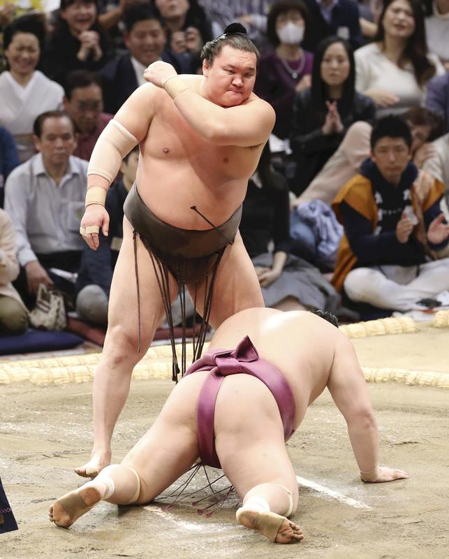 The only yokozuna competing in the tourney, Hakuho slapped Takarafuji to the surface after each of the men tried unsuccessfully to secure the other's mawashi.
