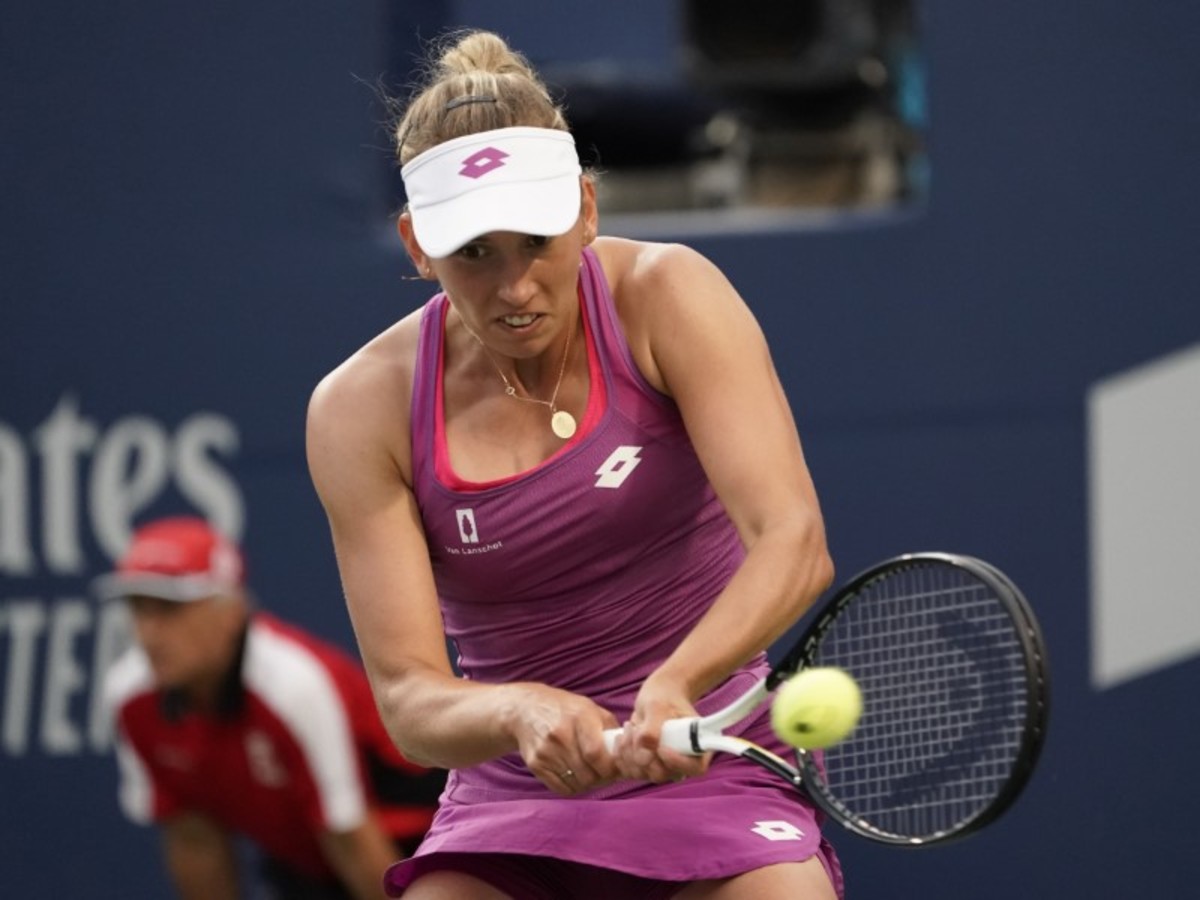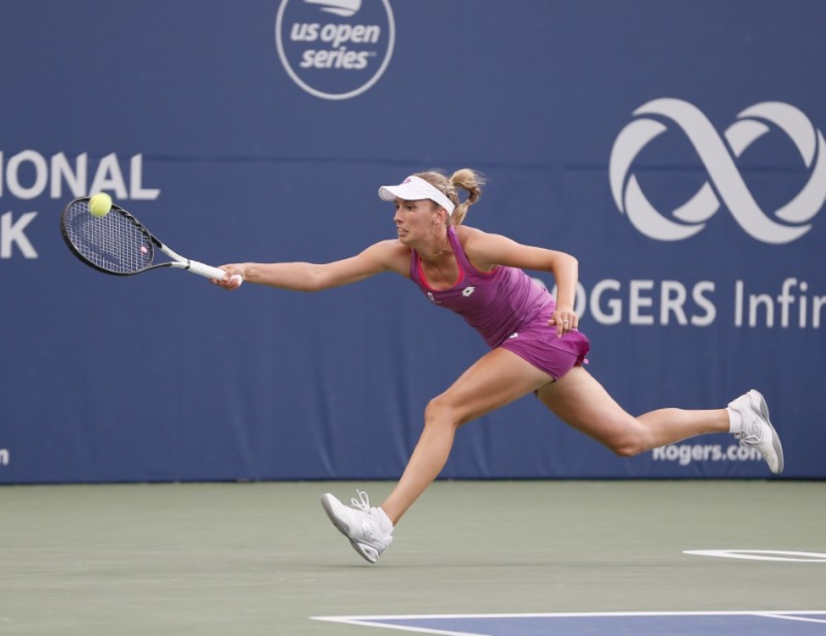 Aug 7, 2019; Toronto, Ontario, Canada; Elise Mertens (BEL) hits a ball to Serena Williams (not pictured) during the Rogers Cup tennis tournament at Aviva Centre. Mandatory Credit: John E. Sokolowski-USA TODAY Sports