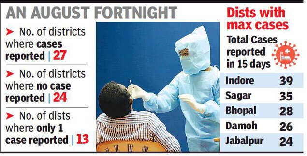 Overall total of 203 new Covid-19 cases have been reported in the state in past 15 days between July 30 and August 13 and of these maximum 39 cases have been reported from Indore, followed by 35 new cases in Sagar and then 28 new cases in Bhopal, 26 new cases from Damoh and 24 new cases from Jabalpur, thus 75% of the total cases, which is 152 new covid-19 cases were reported from these 5 districts of the state.