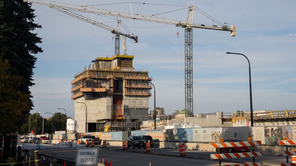 Construction of the Obama Center, which is being financed and built by the Obama Presidential Foundation, is at about the halfway point.
