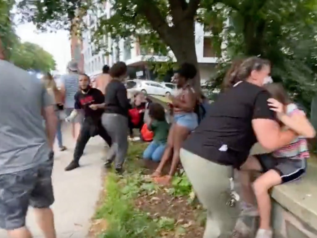 Another protester helps her off the street. Her father yells out "You maced my f****** kid!"
