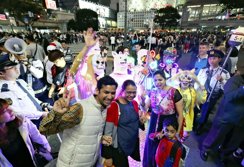 People dressed in Halloween costumes such as popular anime characters and zombies take pictures at the "scramble crossing" in front of Shibuya Station in Shibuya Ward, Tokyo, on Saturday night. However, the cheery atmosphere gave way to chaos later in the night as five people were arrested on suspicion of crimes such as assault and taking up-skirt photos of a woman. In another case, a light truck became trapped in a crowd and was overturned by hooligans. The driver escaped from the truck uninjured.