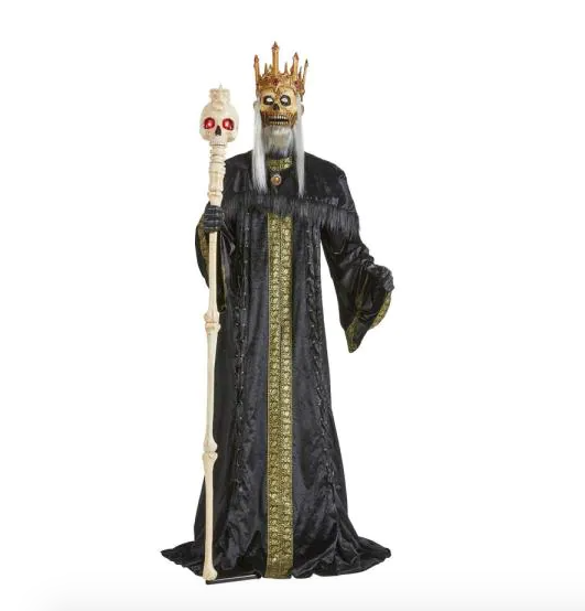 Alas, we are also quite in love with (or afraid of) this King of the Underworld with his glowing eyes and menacing scepter. This six foot bony king and animated mouth rotate on a strong base while he bellows to any trespassers, “Bow down!”