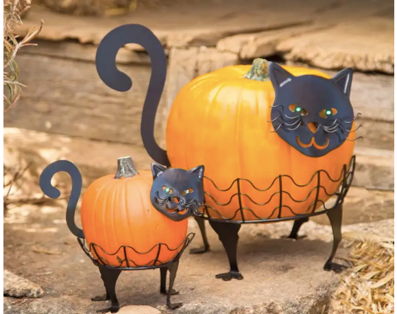Carving pumpkins is great, but leaving them in their natural state will help you keep them fresh longer. Dress them up by placing them in these cute-as-a-button black cat holders with light-up eyes!