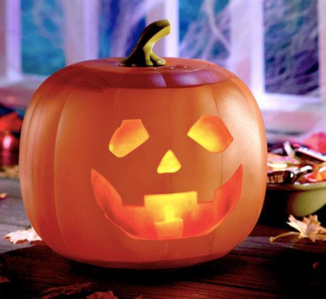 His face may look jolly in this particular photo, but this Jack O’ Lantern can say and emote a whole range of expressions. Watch this video to get a better idea of his range, and invite this cute guy into your home to entertain guests all season.