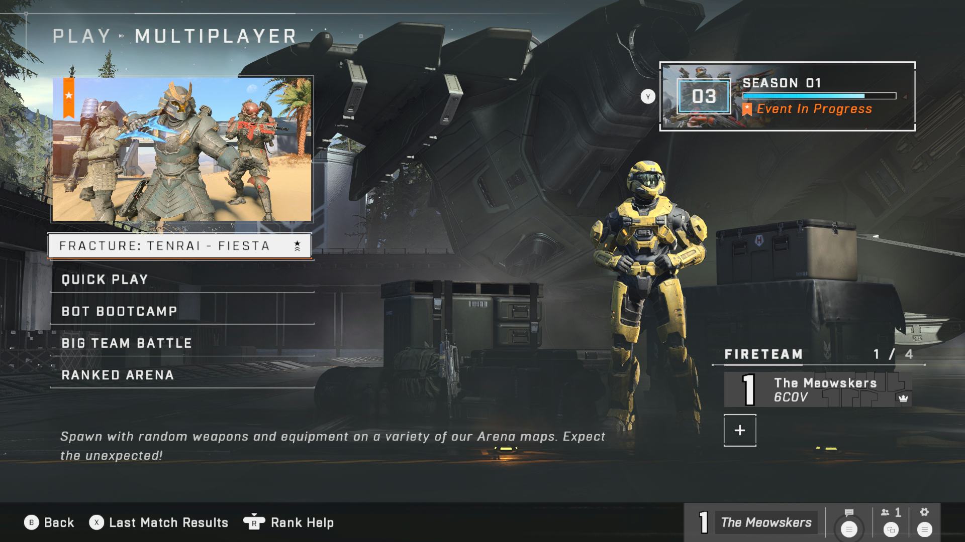 Fiesta is a playlist that coincides with the limited-time Fractured: Tenrai event in Halo Infinite. There are new weekly event challenges that tie to the 30-tier Fractured: Tenrai battle pass. Much like the main battle pass, you need to complete challenges to earn XP and unlock the Tenrai cosmetic rewards.