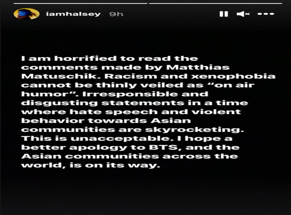 On Friday (26 February) night, Halsey wrote that she was “horrified” by Matuschik’s words as she defended the “Dynamite” hitmakers.