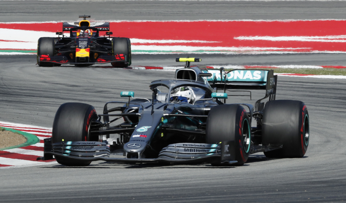 Hamilton squeezed through while Vettel slightly locked up and damaged his tyres, with Bottas holding on to second place after a slight correction and Verstappen sweeping through from fourth on the grid to third.