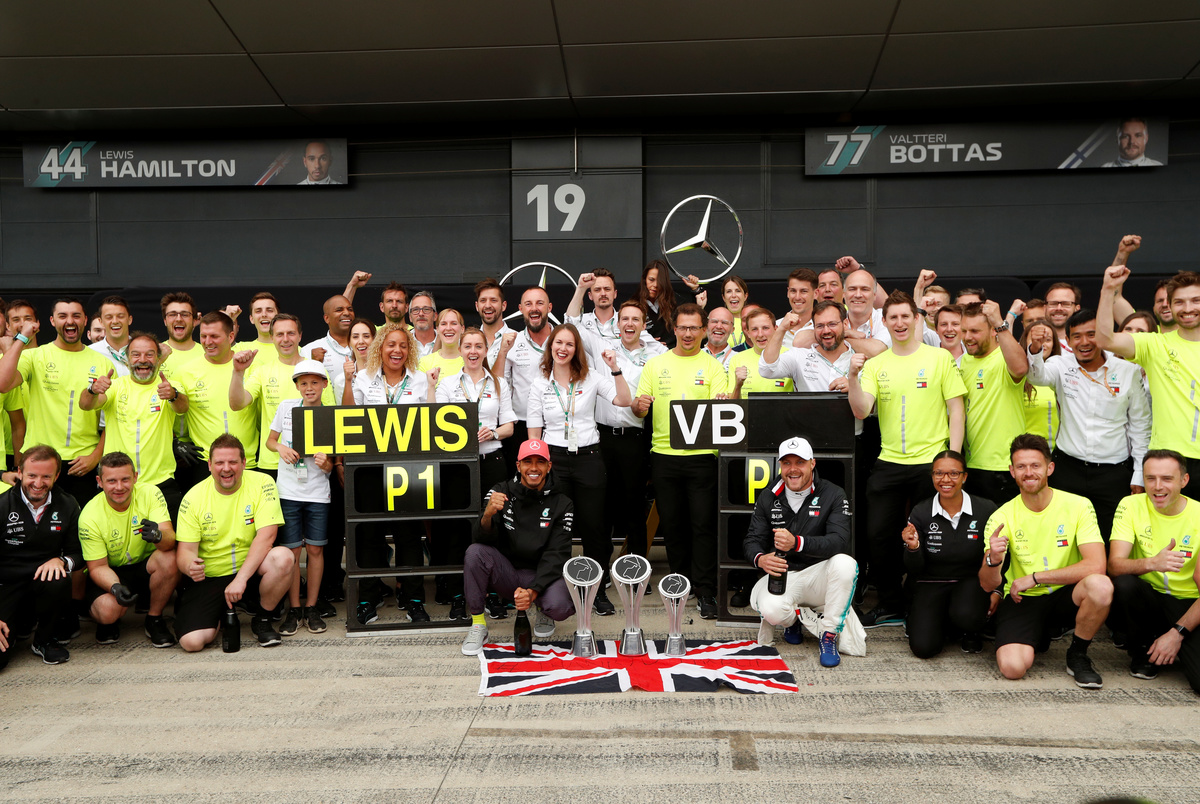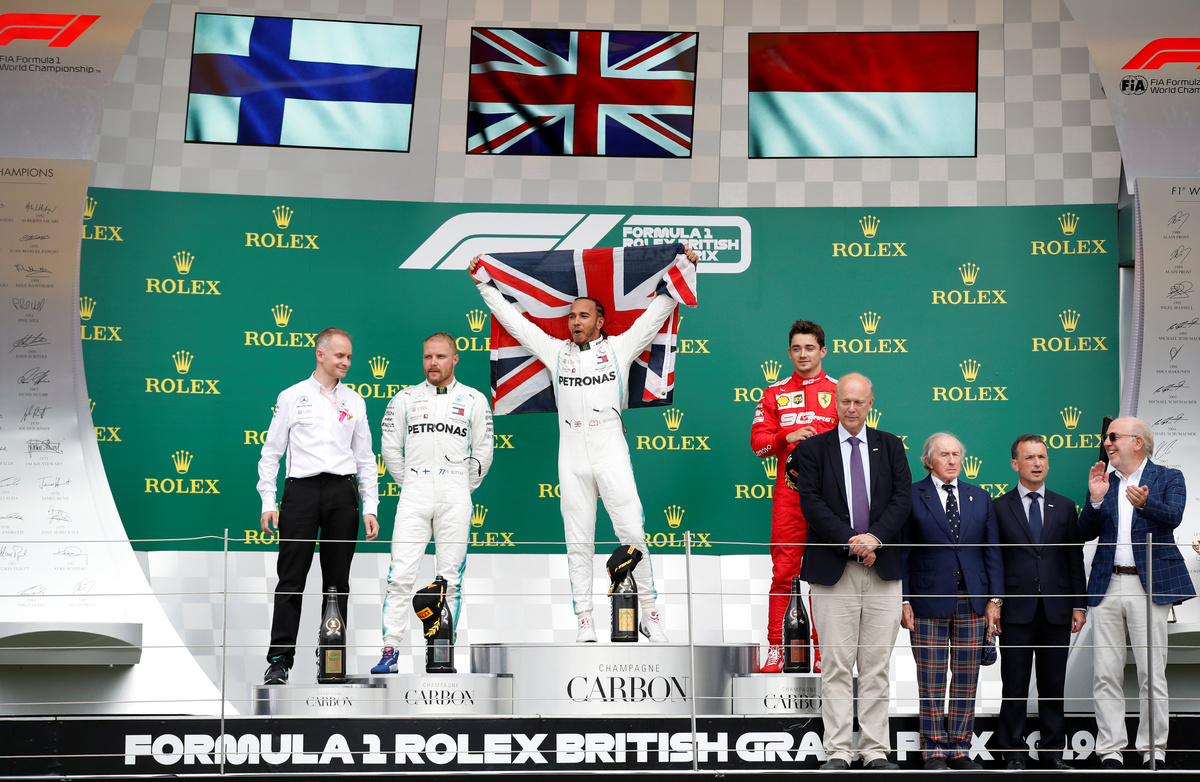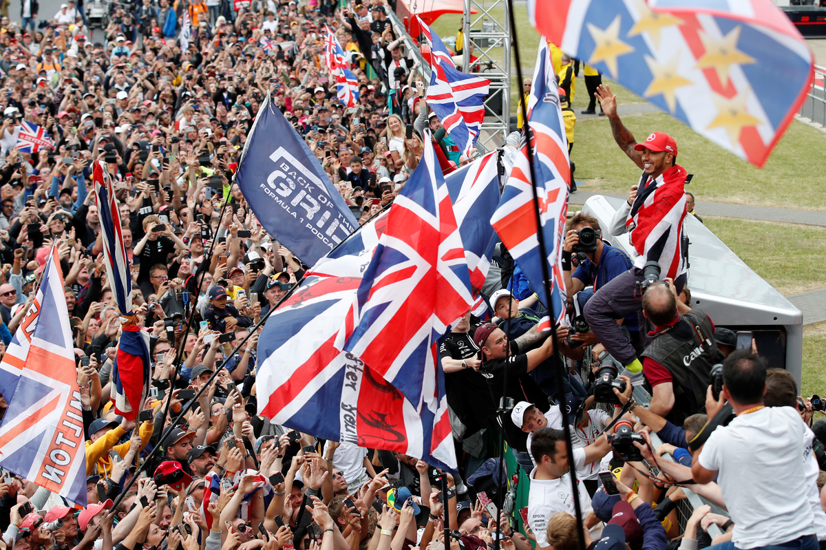 With the Union Jack fluttering from his Mercedes after it was handed to him by a marshal on his victory lap, the five-times world champion basked in the adulation of a sellout 141,000-strong crowd.