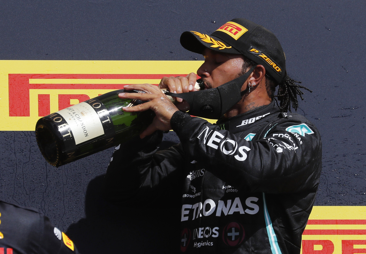 All the drivers took part before the start in a stance against racism, with Hamilton one of 13 taking a knee as the other seven stood behind.