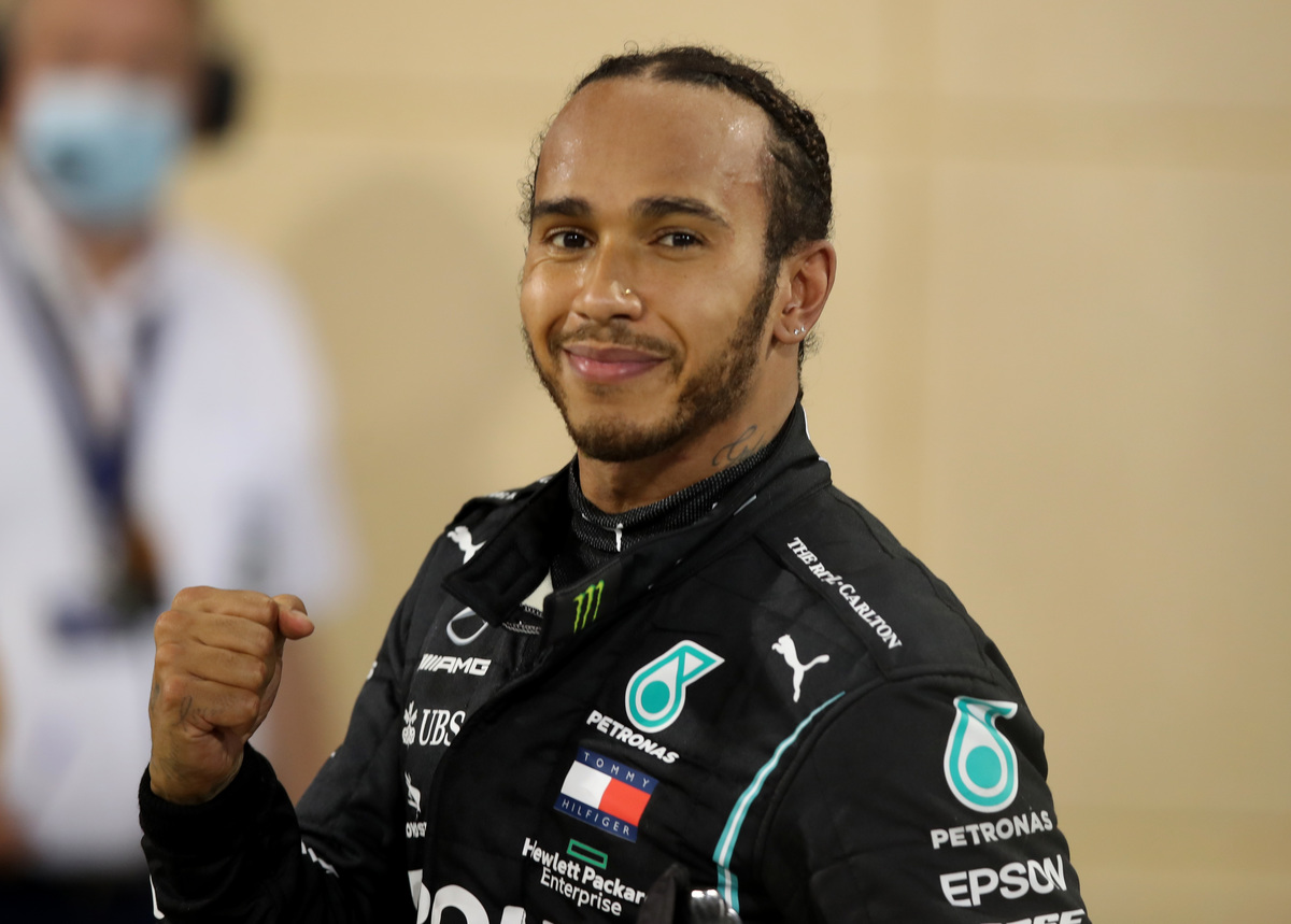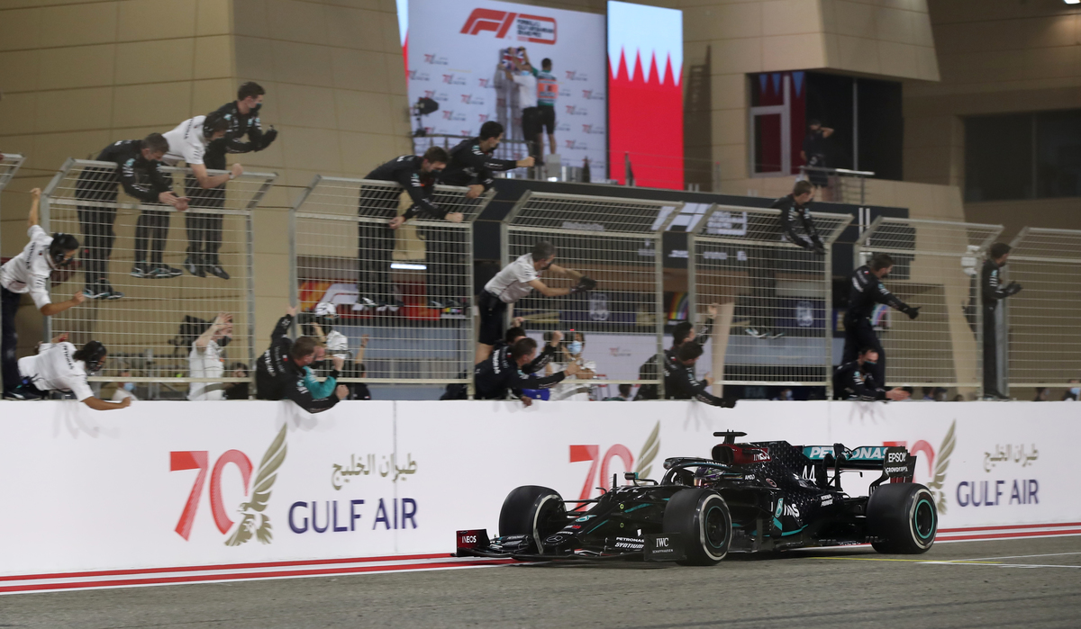 Lewis Hamilton won the Bahrain Formula One Grand Prix for Mercedes on Sunday after French driver Romain Grosjean had a miraculous escape from a fiery first-lap crash that ripped his car in two.