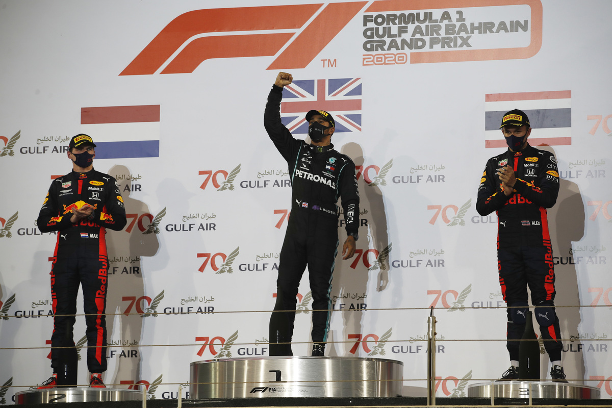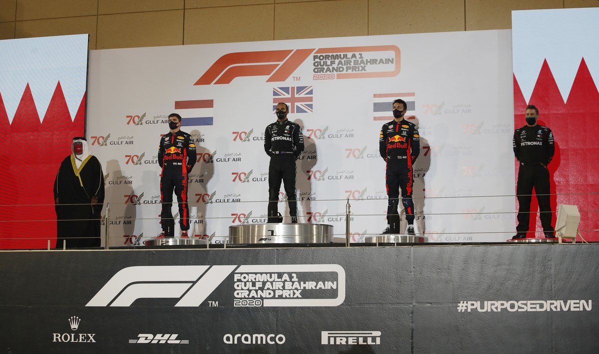 It was a Red Bull double on the podium as British-born Thai driver Alexander Albon took third from Sergio Perez after the Racing Point driver suffered a blown engine three laps from the end.