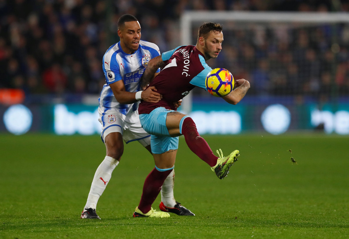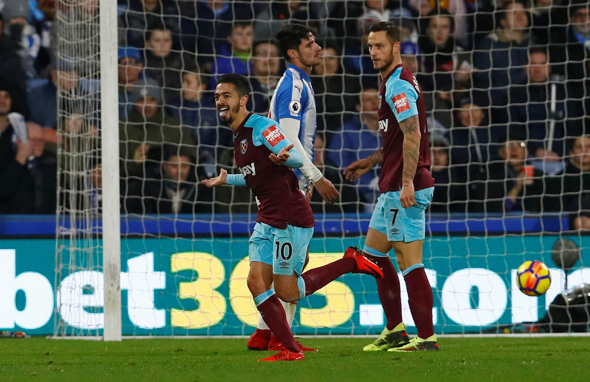 A Manuel Lanzini double plus strikes from Mark Noble and the impressive Marko Arnautovic gave the visitors a comfortable victory that took them above Huddersfield, for whom Joe Lolley scored and new 14 million pound ($19.2 million) signing Alex Pritchard came on as a substitute.