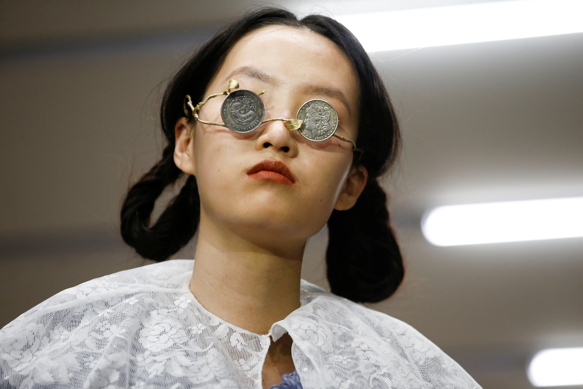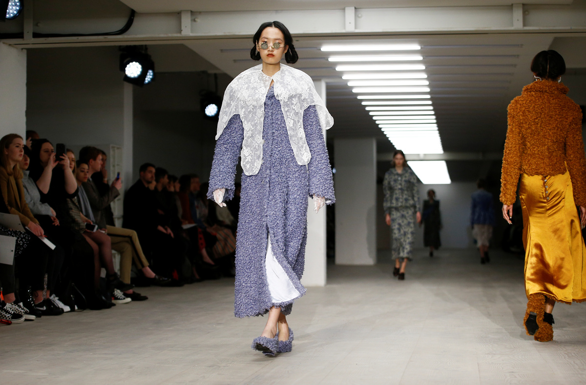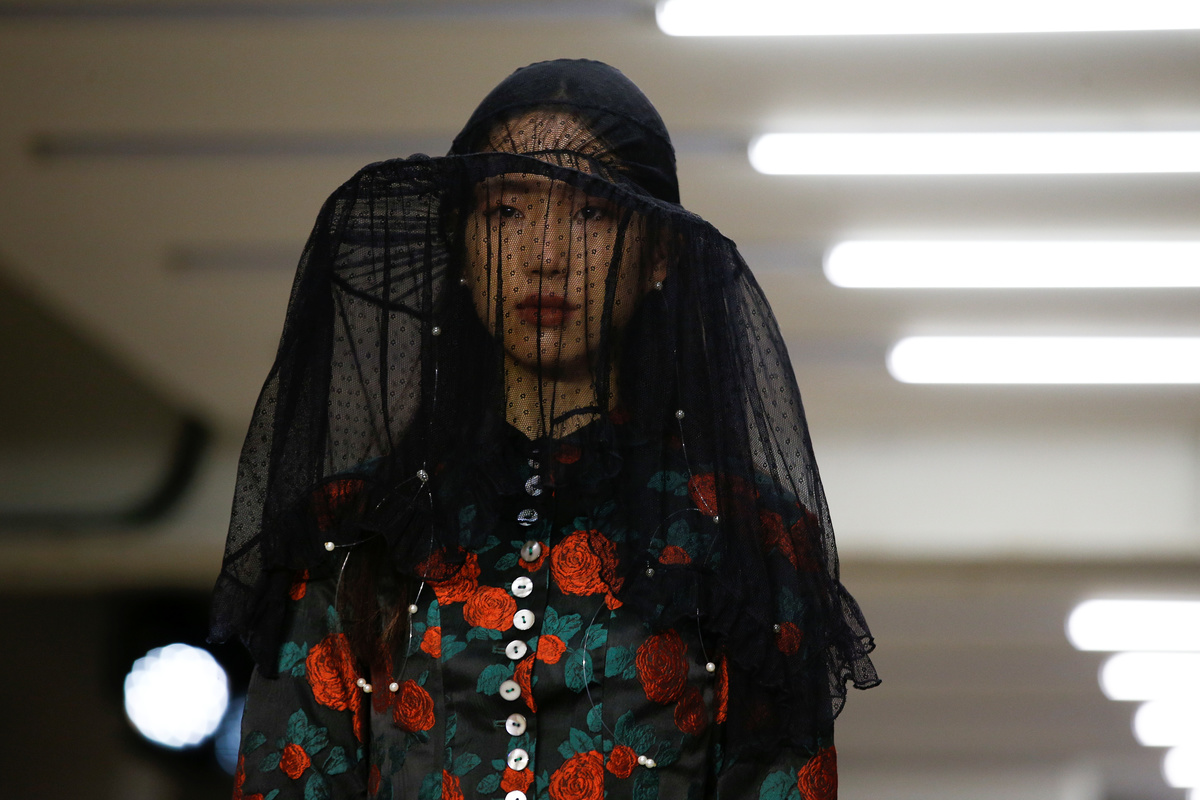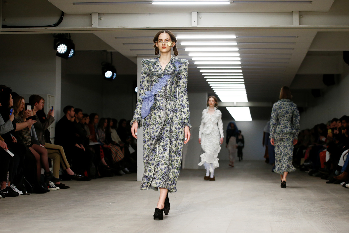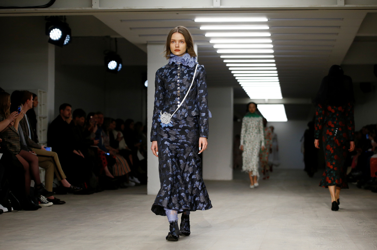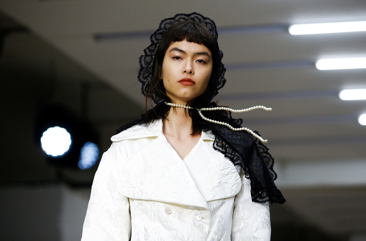 Kicking off the catwalk shows was Chinese designer Yuhan Wang, who overcame the difficulties wrought by the virus outbreak to present a first solo collection of Victorian-inspired waisted jackets in floral prints and lace-trimmed outfits accompanied by whimsical pearl jewellery.