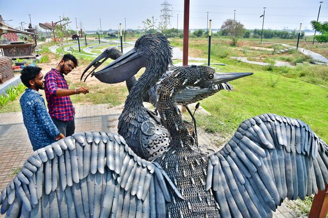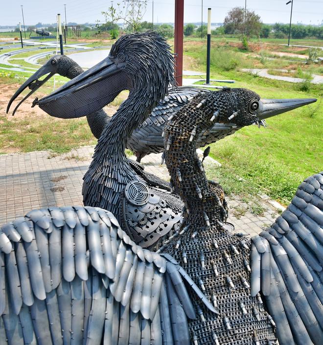 Coimbatore’s wetlands draw flamboyant migratory birds, from flamingoes and painted storks to garganeys and ducks. There have been sightings of hundreds of little grebes, spot-billed pelicans, barn swallows sometimes numbering over 400 and rare visitors like Eurasian widgeon, the migratory bird from Europe. “With art installations of water birds we wanted to highlight the thriving bio-diversity of the Coimbatore wetlands,” says Corporation Commissioner Prathap IAS, as he gets ready to join his new posting in Chennai as joint managing director of the Tamil Nadu Urban Habitat Development Board. “The artefacts serve as a wake up call to the enormous amount of scrap that the city generates every day, which is 1200 tonnes. While 500 tonnes goes into the land fill, the remaining is repurposed,” he says adding that he got the idea while visiting the Bharath Darshan Park in Delhi that showcases attractive replicas of several iconic monuments of India built using scrap and waste materials like used fans, nuts and bolts, and unused vehicles.