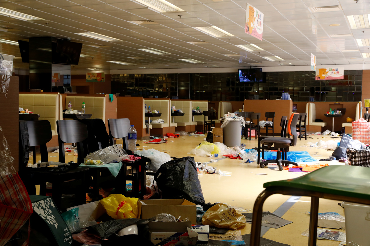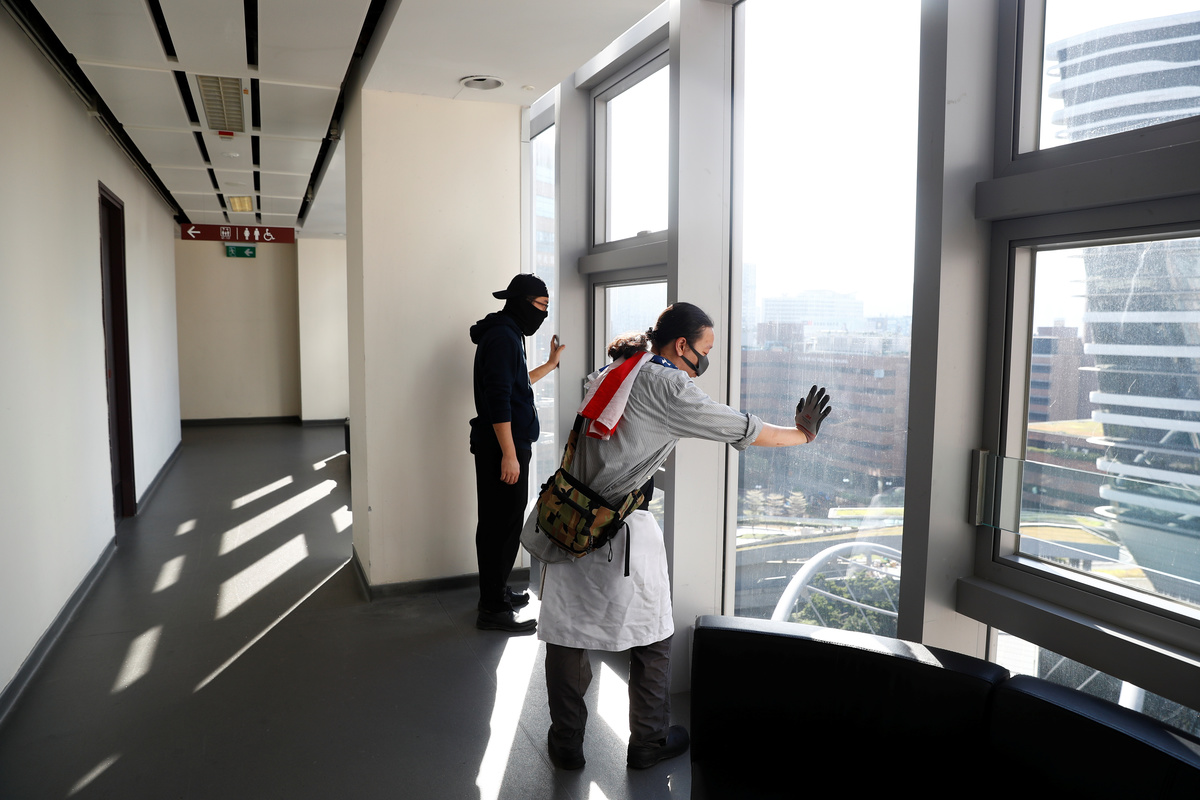 Many levels of the buildings look like abandoned hideouts strewn with remains — rucksacks, masks, water bottles, cigarette butts, with security cameras smashed throughout. Lockers were stuffed with gas masks and black clothes, and a samurai sword lay on the ground where it was abandoned.