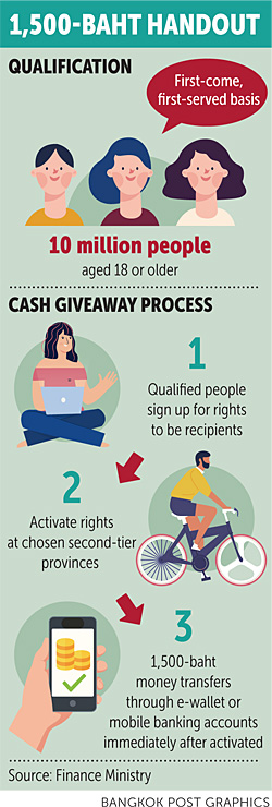 A 1,500-baht cash handout for spending in 55 second-tier provinces will be allocated to 10 million people who register to participate in the scheme on a first-come, first-served basis.