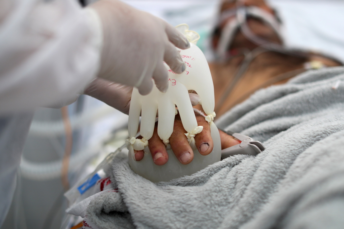 Cunha demonstrated how she puts the gloves on an unconscious man fighting for his life against COVID-19, placing one glove on each side of the hand.