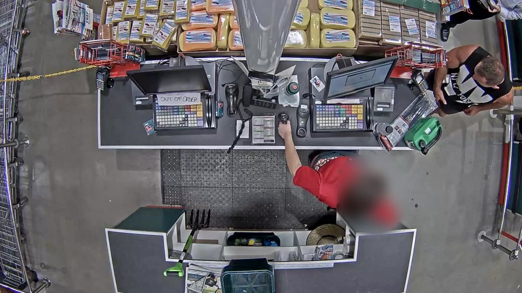 Clad in his trademark muscle singlet, the former gym owner can be seen calmly strolling the aisle, pausing for 10 seconds with a bag of zip ties in his hands before he reaches in, grabs a fuel can and goes to pay.
