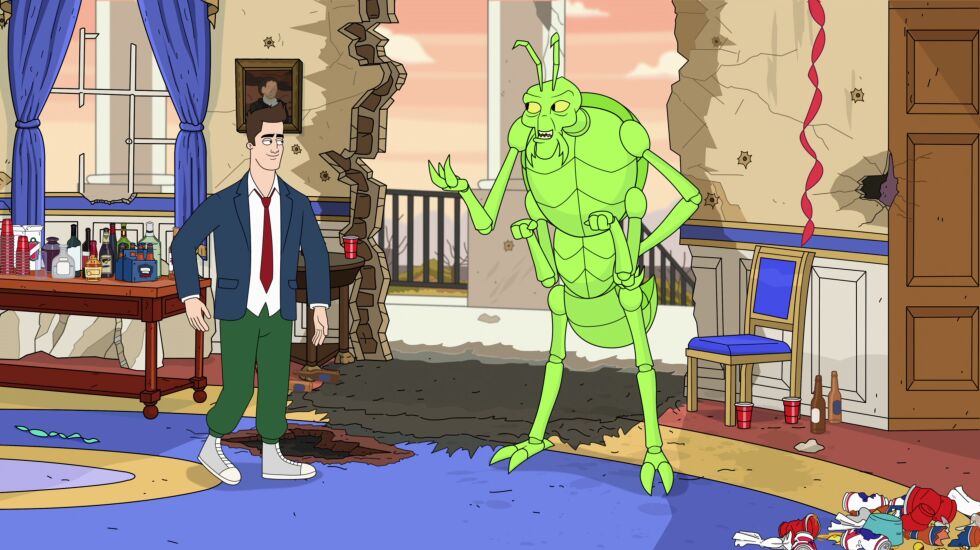 The all-star voice cast also includes Ayo Edebiri from “The Bear” as a 12-year-old boy who convinces everyone he’s a general in his 50s simply by wearing the melted general’s uniform; Daniel Radcliffe as an English party boy who appoints himself king because he’s the last surviving British citizen, and Phil LaMarr as Gen. Axatrax, the only alien survivor of the invasion, who can’t believe these are the idiots who captured him. (Cue the interlude where Dr. Braun bonds with the horrific appearing but intelligent and sensitive Axatrax, and yes, there’s a “Shape of Water” reference.)