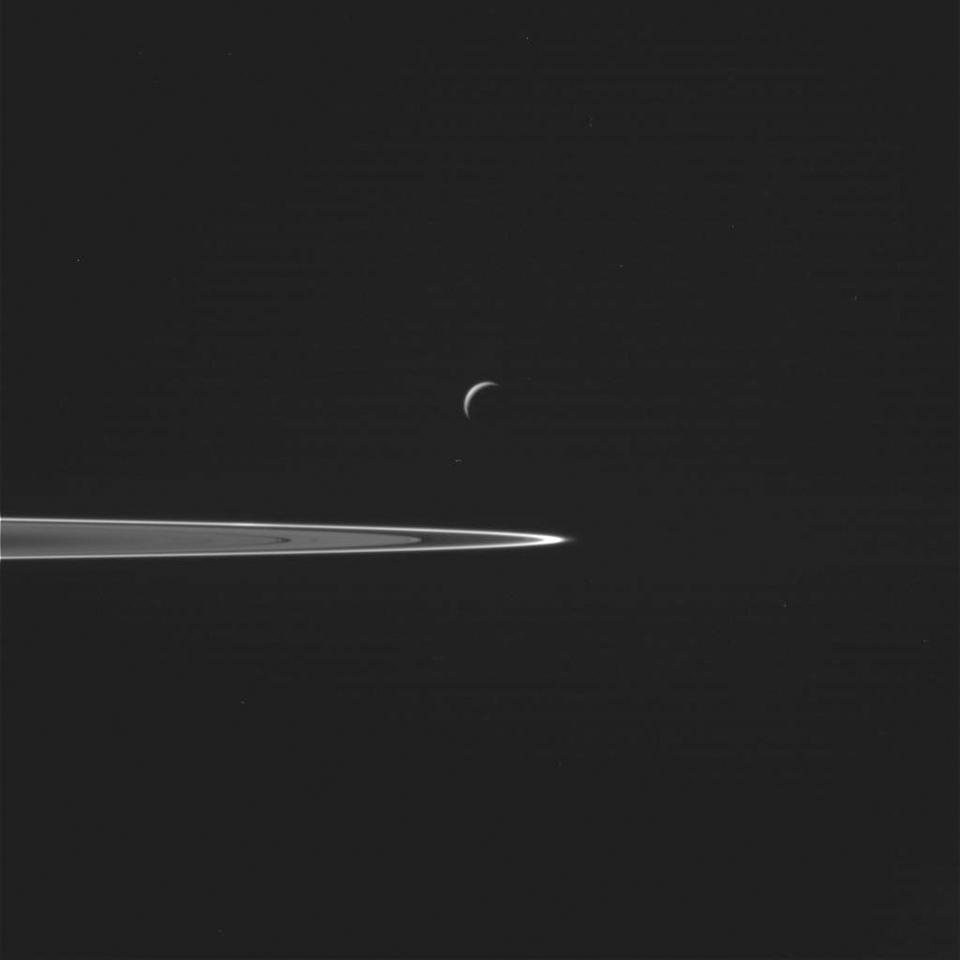 The conclusion is inescapable, it’s the geyser-like activity emerging from these jets that is doing the resurfacing! But that’s not all those geyser-like jets are doing. Saturn doesn’t just have moons and its main rings, but also fainter, outer rings. One of them, the E-ring, just so happens to align with the orbit of Enceladus. In a breathtaking leap, Voyager scientists used the high reflectivity, smooth surface, and active jets on Enceladus to predict that the E-ring was formed by particles emitted from Enceladus’ surface!