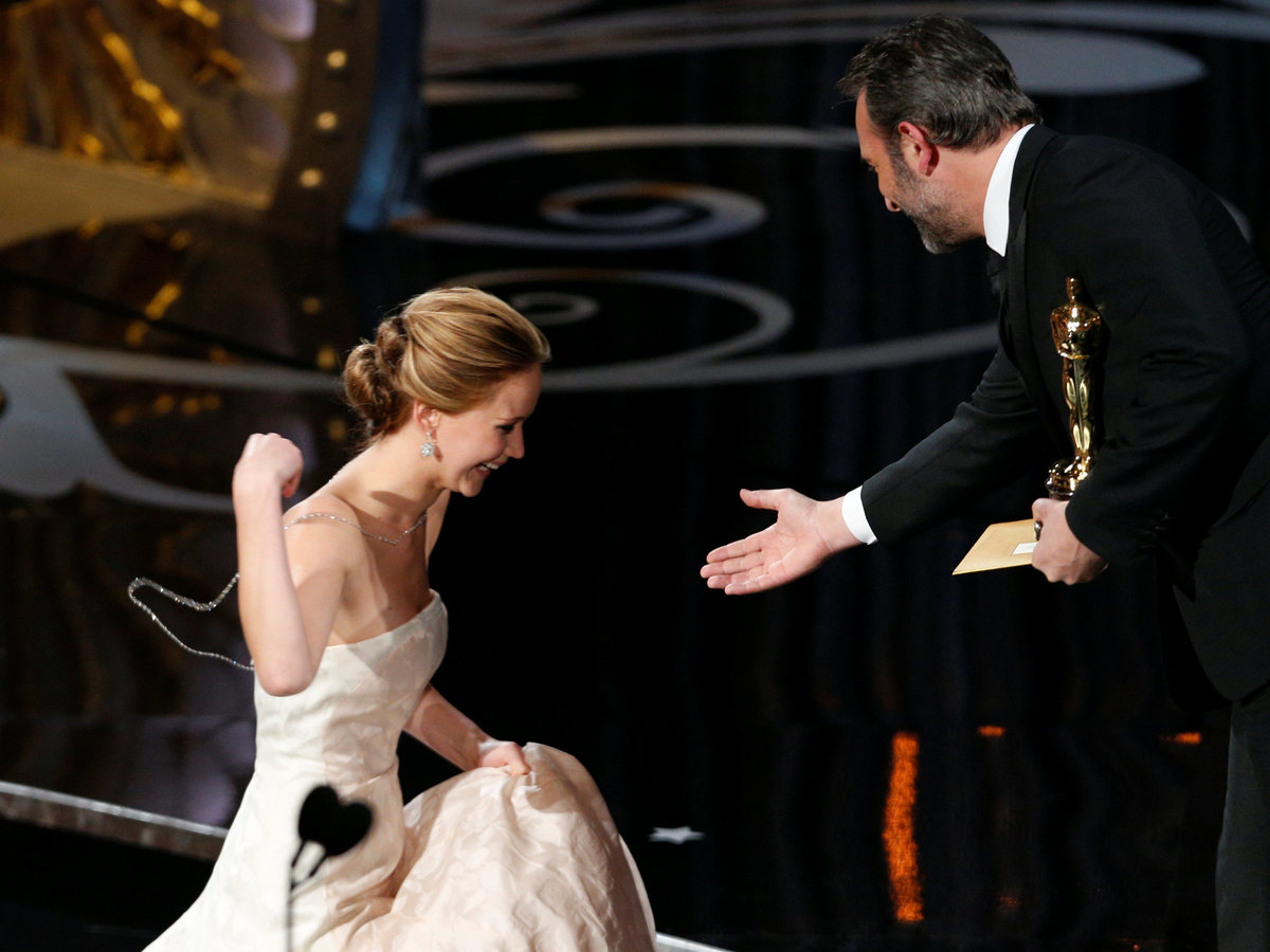 2013 - Jennifer Lawrence trips and falls on her way to accept the best actress award for her role in "Silver Linings Playbook." She receives a standing ovation, prompting her to joke that "you're all only standing because I fell and that was embarrassing."