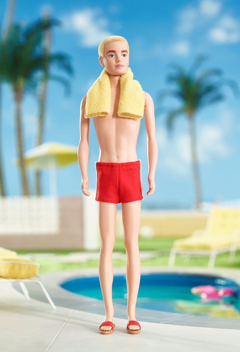 Toymaker Mattel has recreated a version of the first Ken doll, dressed in red swimming trunks, sandals and carrying a yellow towel on his shoulders.