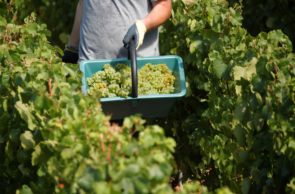 At the Brun de Neuville vineyard collective, to which Leglantier belongs, teams of pickers in baseball caps worked their way along rows of vines, collecting grapes by hand. Most are migrant workers from eastern Europe who come every harvest season.