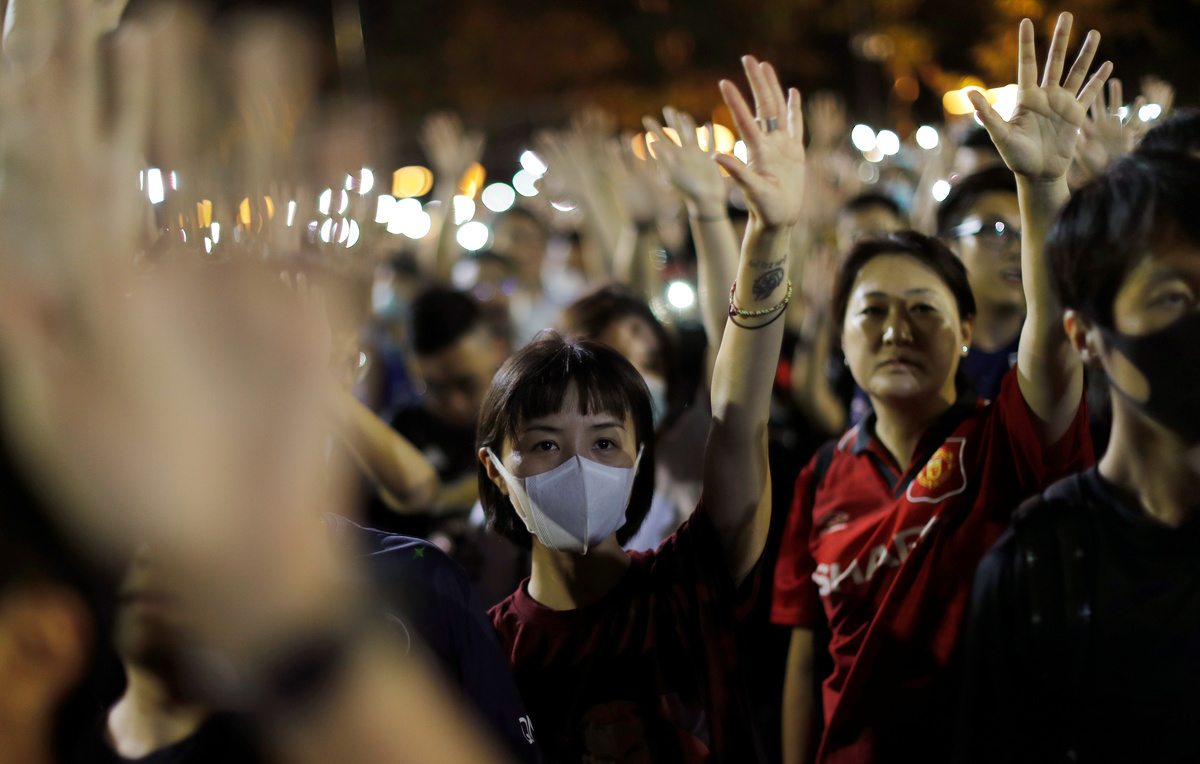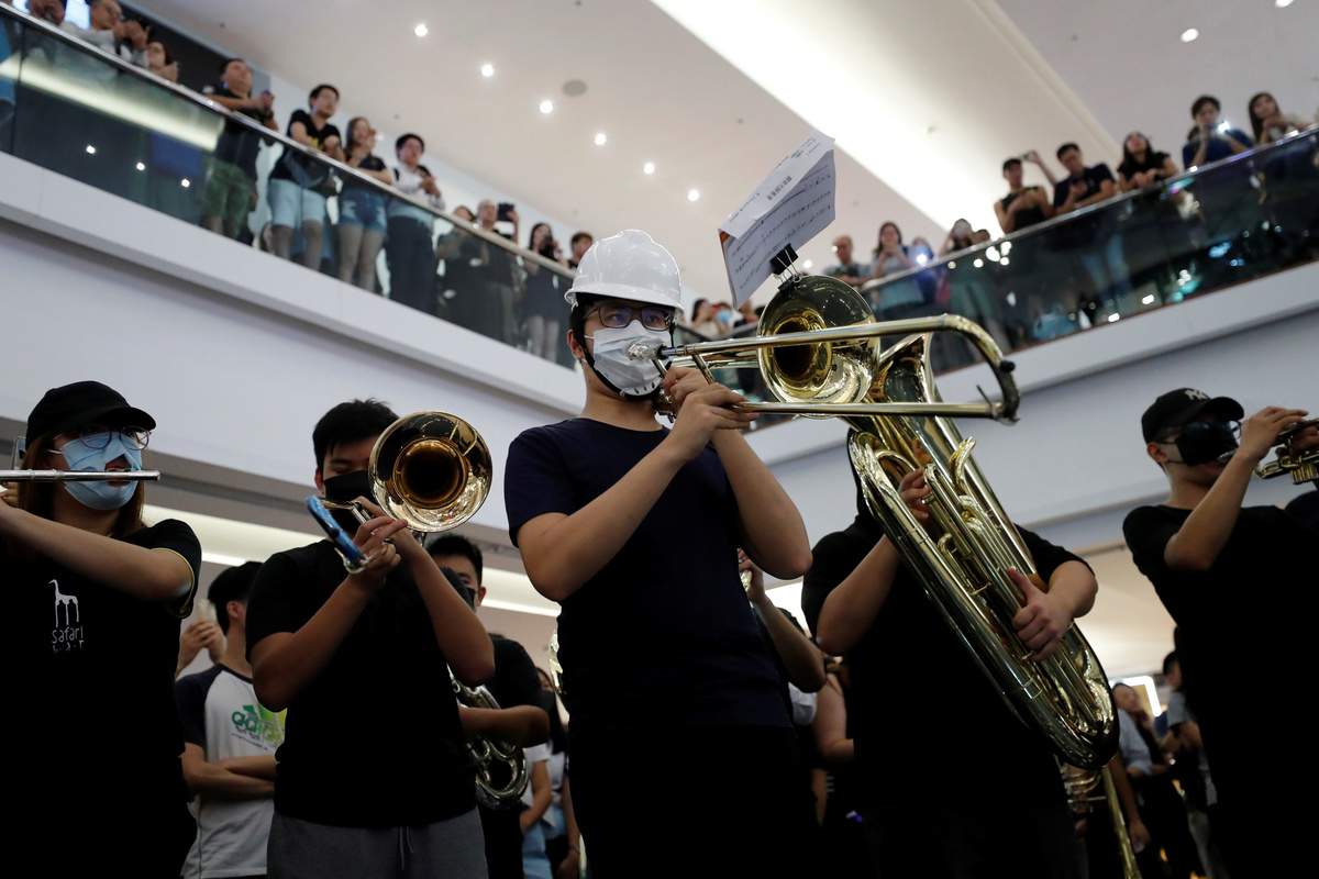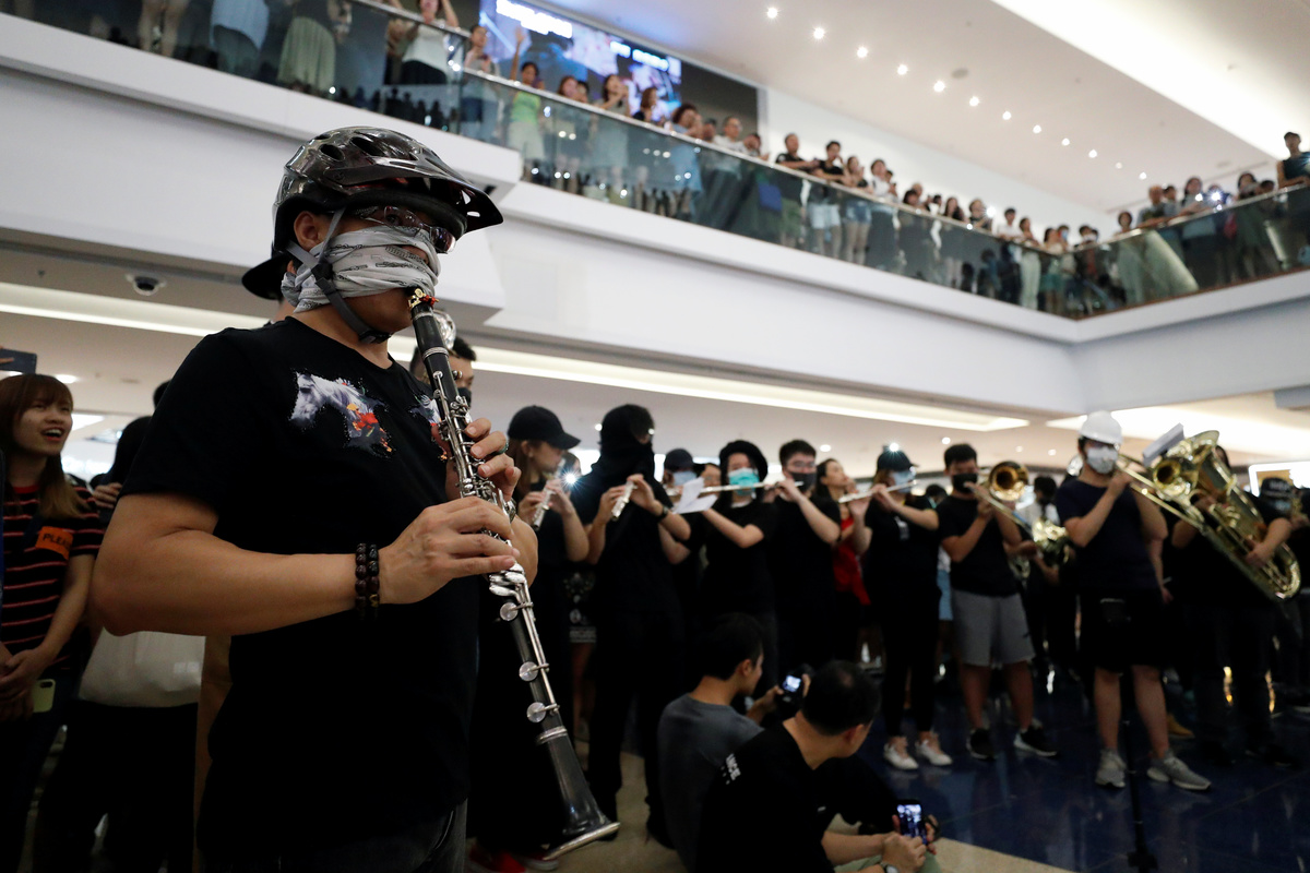 In a direct challenge to Beijing, some protesters threw bricks at police outside the Chinese People's Liberation Army base and set fire to a red banner proclaiming the 70th anniversary of the founding of the People's Republic of China.