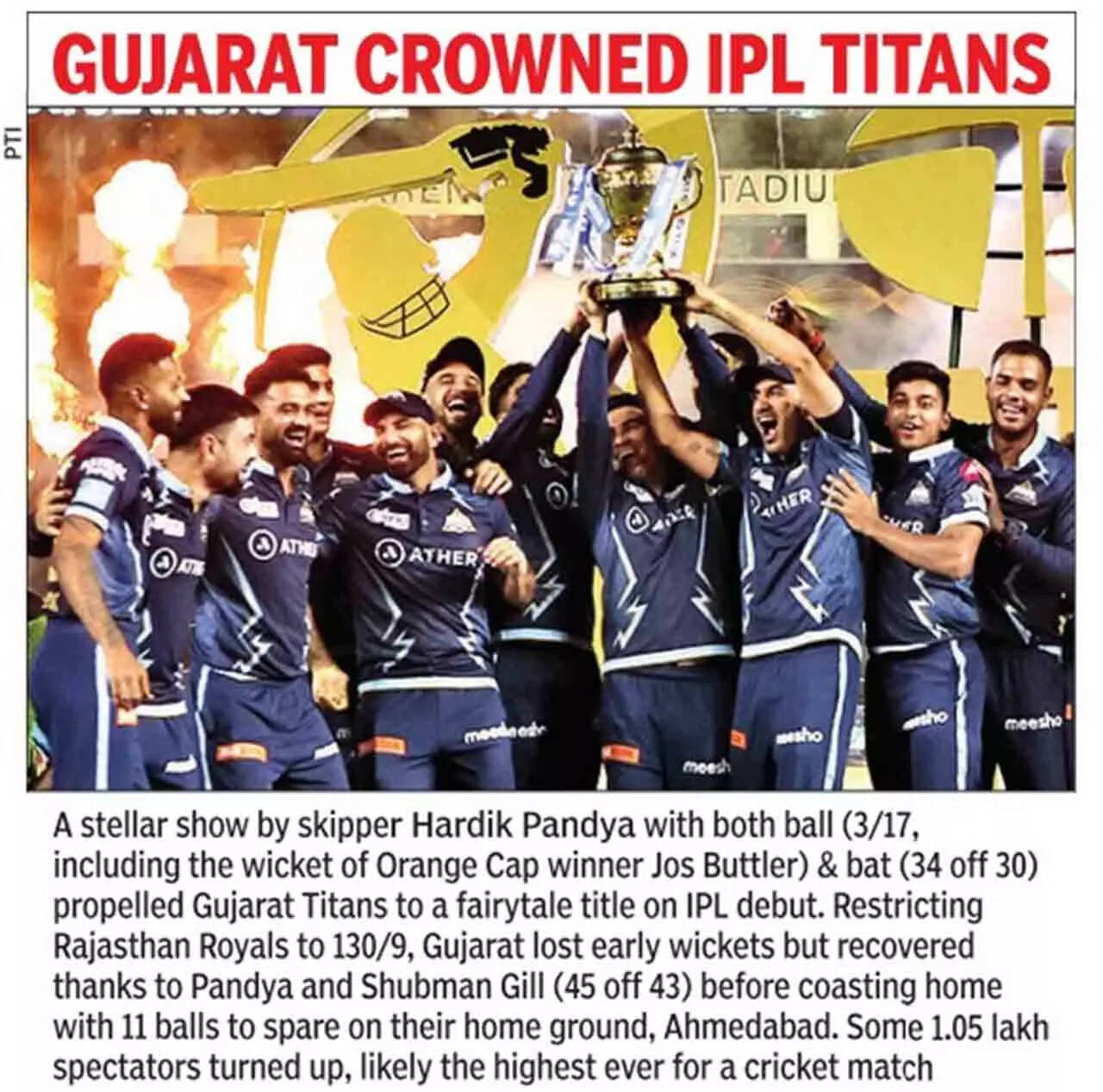 AHMEDABAD: In the end, with their captain Hardik Pandya leading the charge with both the bat and ball, nothing was going to stop Gujarat Titans from holding the IPL trophy this year.