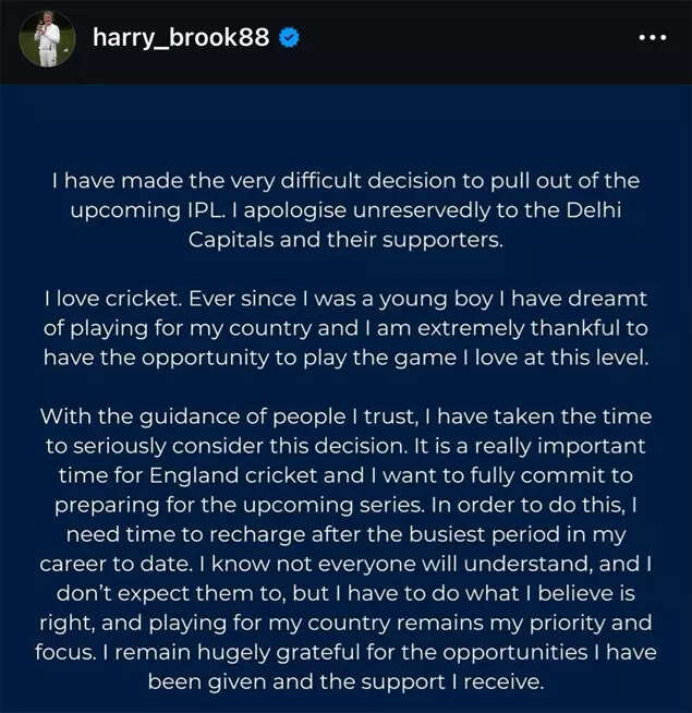 "I have made the very difficult decision to pull out of the upcoming IPL. I apologize unreservedly to the Delhi Capitals and their supporters," Brook announced on social media this week.