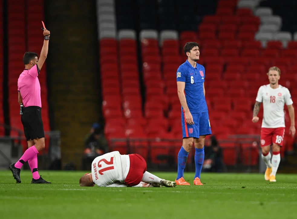 Harry Maguire was sent off during the first half of England's Nations League defeat to Denmark as his nightmare season continued.
