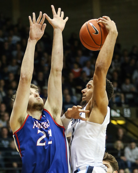 The Eagles (3-8) were led by Delante Jones with 12 points and freshman Sa'eed Nelson with 11. American shot 28.6 percent in the second half and 37.3 percent for the game.