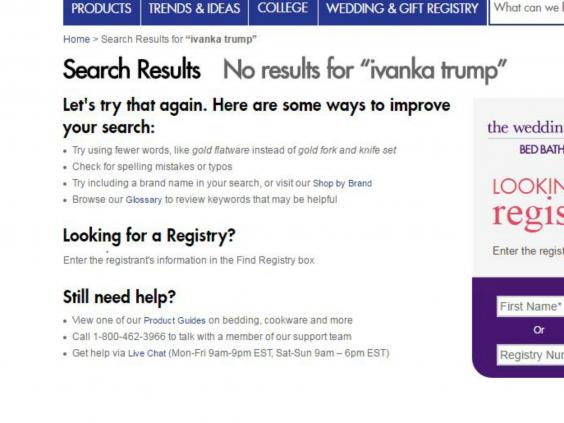 A quick scan of the company’s website found that searching “Ivanka Trump” in “All Departments” yielded no results.